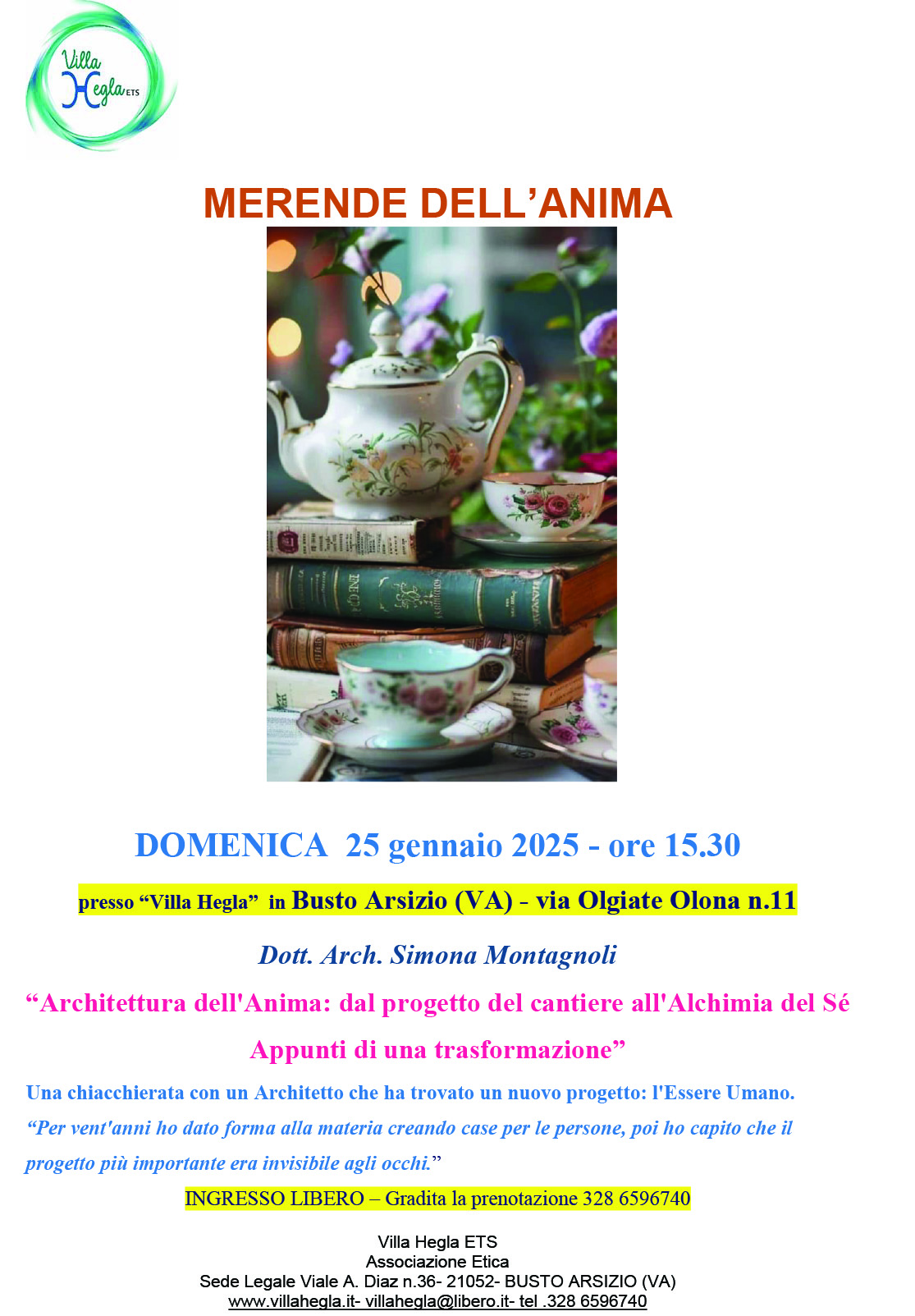 Villa Hegla organizza alle ore 15.30 in Busto Arsizio via Olgiate Olona, 11 incontro del ciclo “Merende Dell’Anima” ritrovo che si svolgerà con una cadenza mensile.